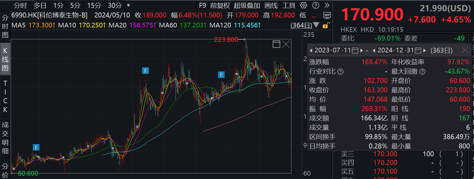 科伦博泰股价上市以来表现强劲 累计涨超169%