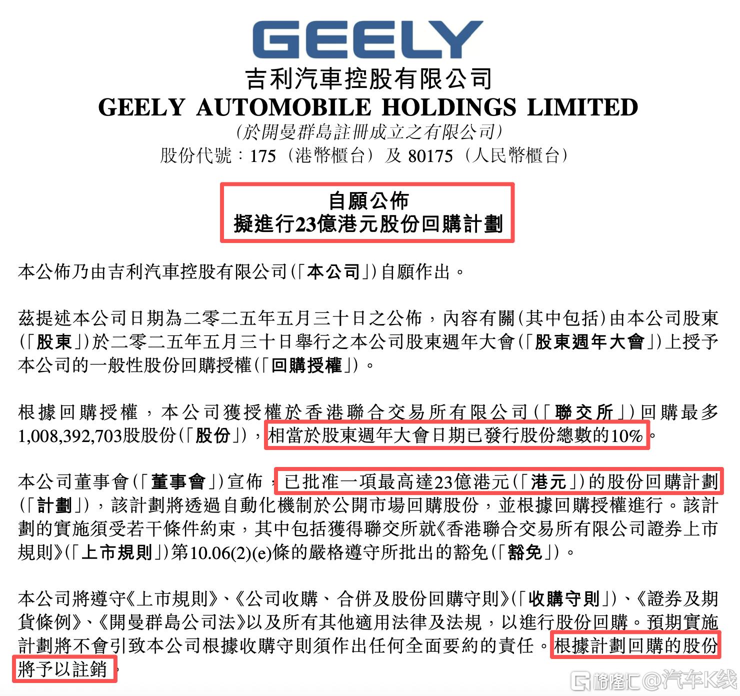 最高23亿港元!吉利汽车拟实施股份回购计划,展现长期发展信心