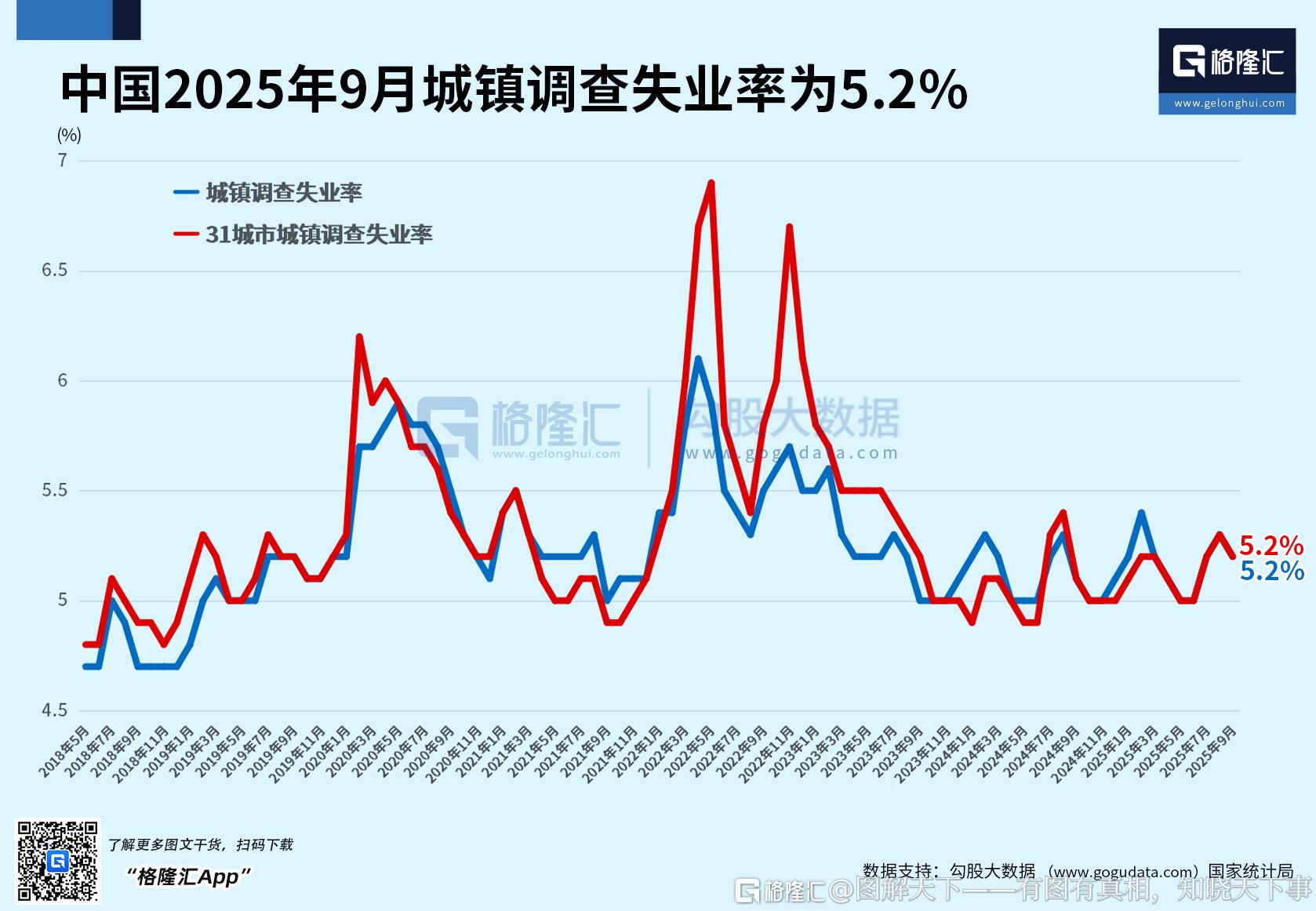 中国2025年9月城镇调查失业率为5.2%