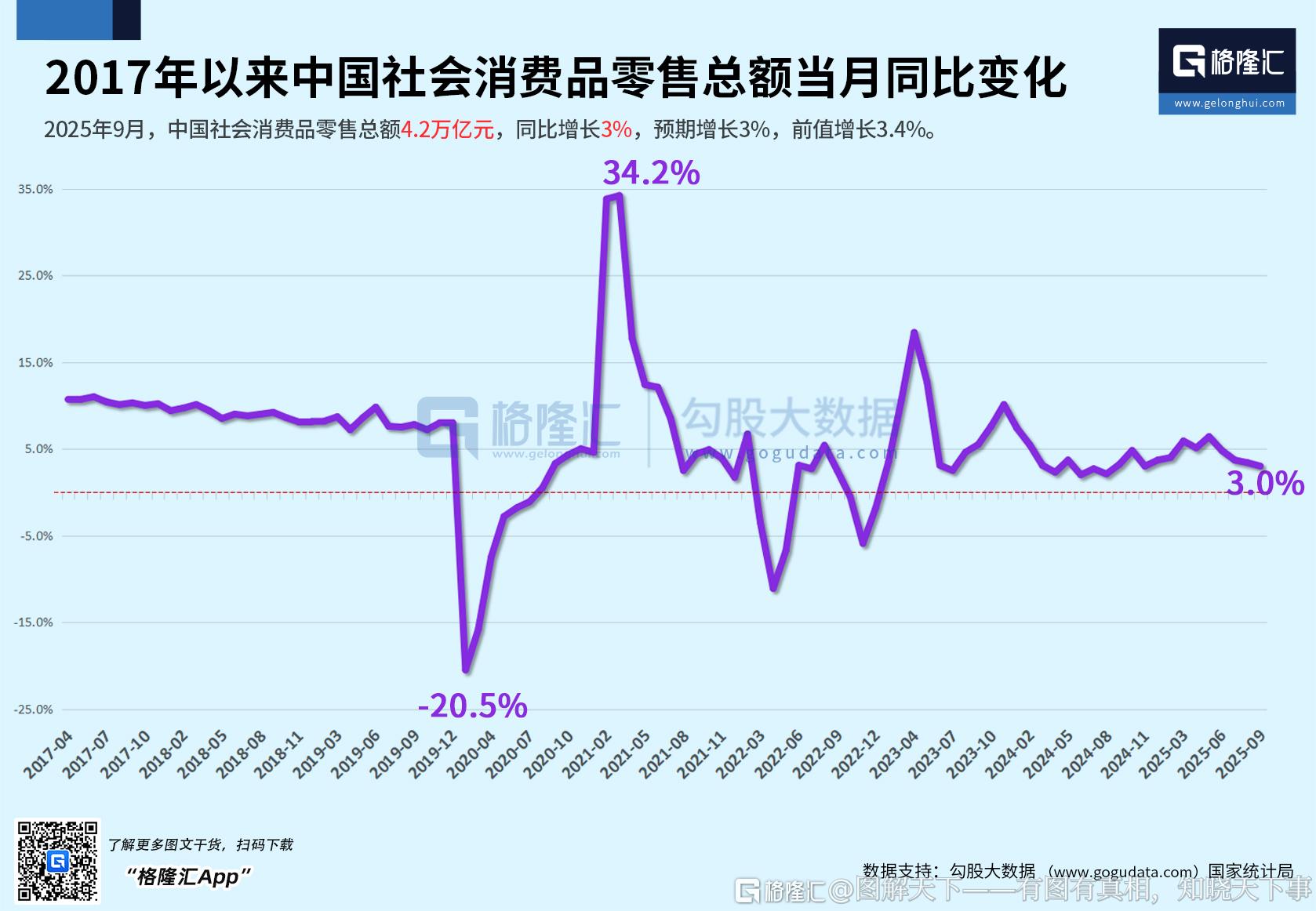 2017年以来中国社会消费品零售总额当月同比变化