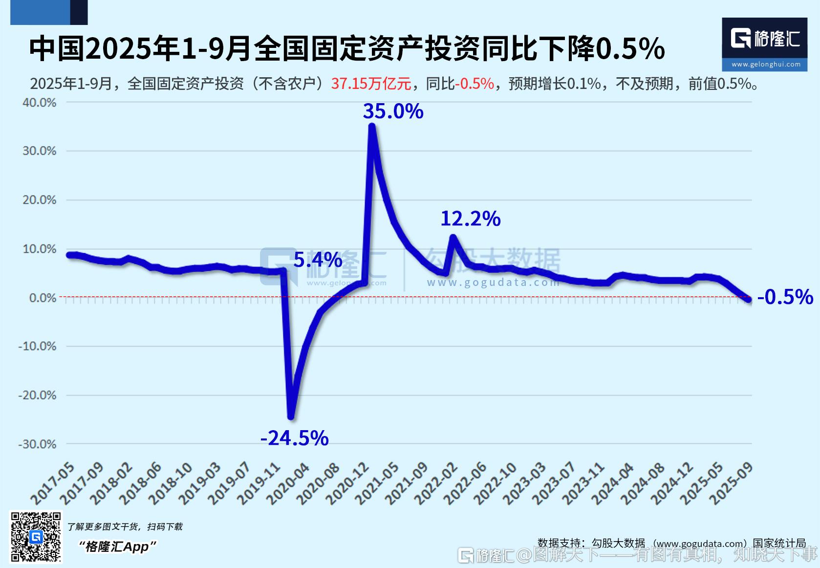 中国2025年1-9月全国固定资产投资同比下降0.5%
