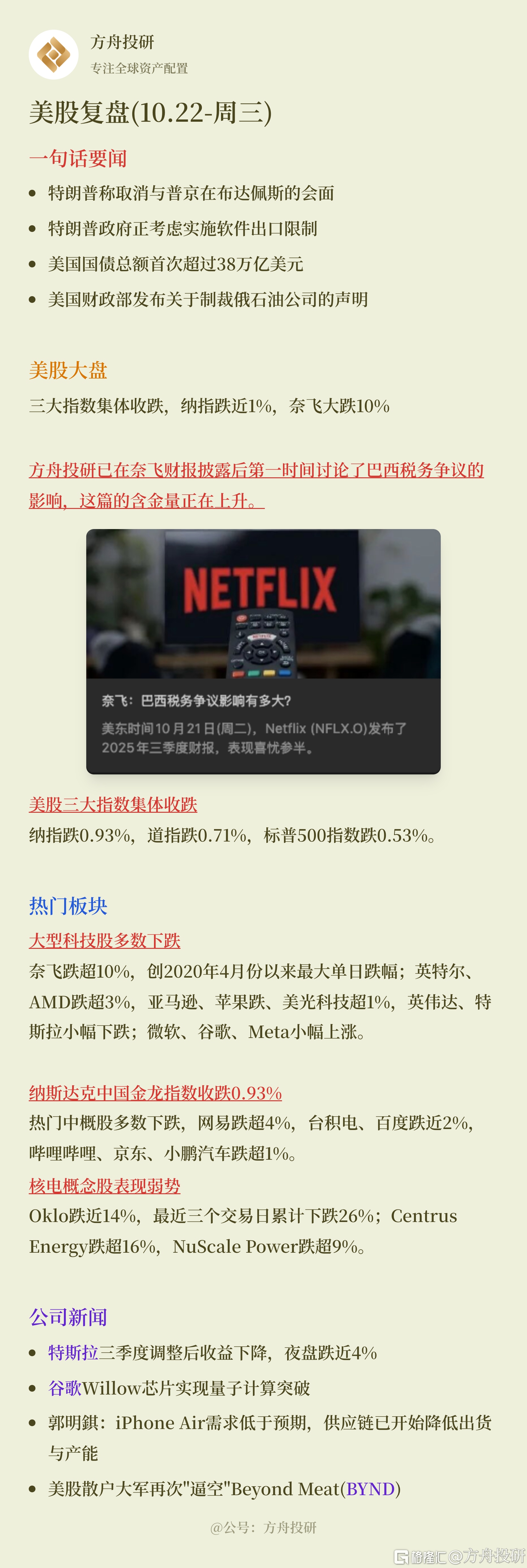 美股复盘10.22周二-奈飞惊魂堕高台 量子蝶梦醒残宵