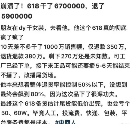 还有这样的:「求你们别退货了,第一波退货潮,退了好多,发了两万,退了一万……」