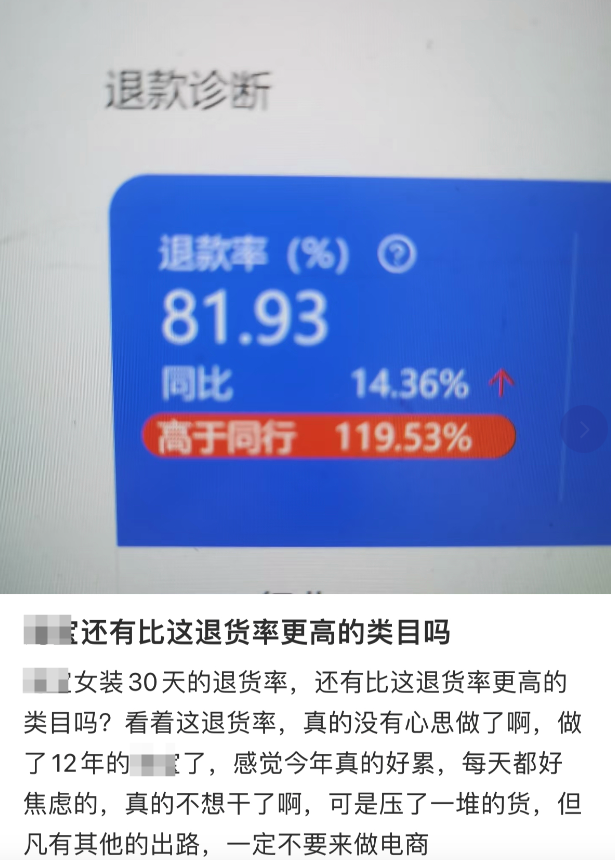 该商家表示这是30天的退货率。「看着这退货率,真的没心思做了啊,做了12年的某平台女装了,感觉今年真的好累,每天都好焦虑的,真的不想干了啊,可是压了一堆的货,但凡有其他出路,一定不要来做电商」