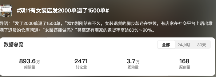 无独有偶,在今天的热搜上,还有这这两个话题挂在榜上。一个是「双11有女装店发2000单退了1500单」,话题信息同时显示,有商家的退回率达到了80%-90%。