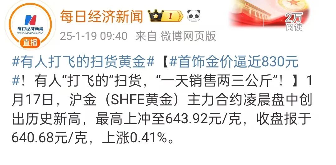 另外,周末黄金价格也在不断攀升,据每日经济新闻报道:1月17日,黄金珠宝品牌金价也有所上涨,周大福、周生生、老庙黄金、六福珠宝、潮宏基的首饰金价格分别为827元/克、829元/克、829元/克、827元/克、827元/克。