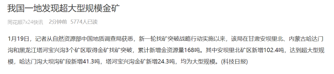 除此,今天同花顺快讯消息:我国一地发现超大型规模金矿。