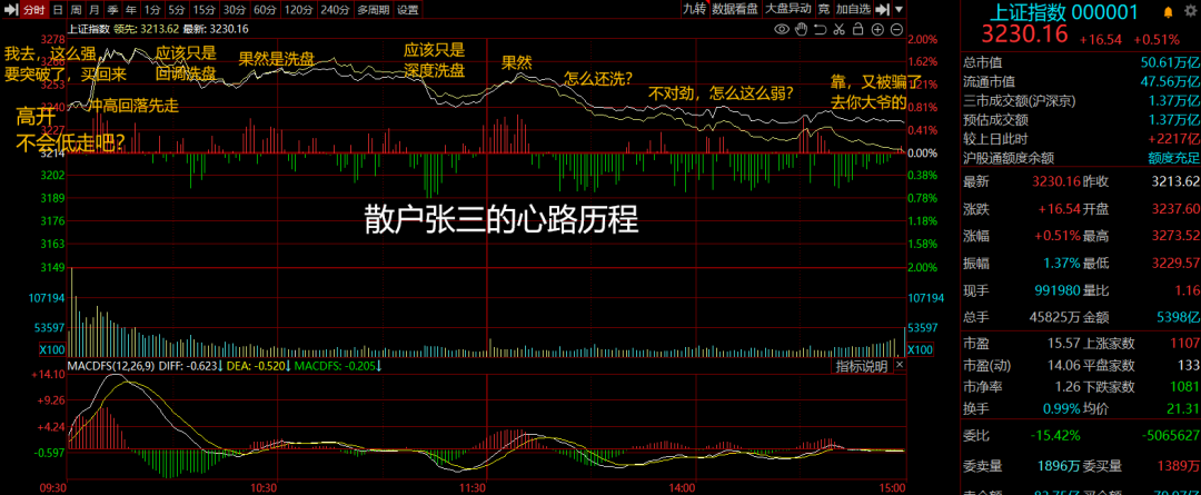 放量必然是买卖增加了,如果是主力资金进场,总成交金额就肯定要突破15000亿了,但是现在只有一万三千多亿,很明显就是散户散户来回买卖搞出来的。下面再来模拟一下早盘散户张三的新路历程,如下图: