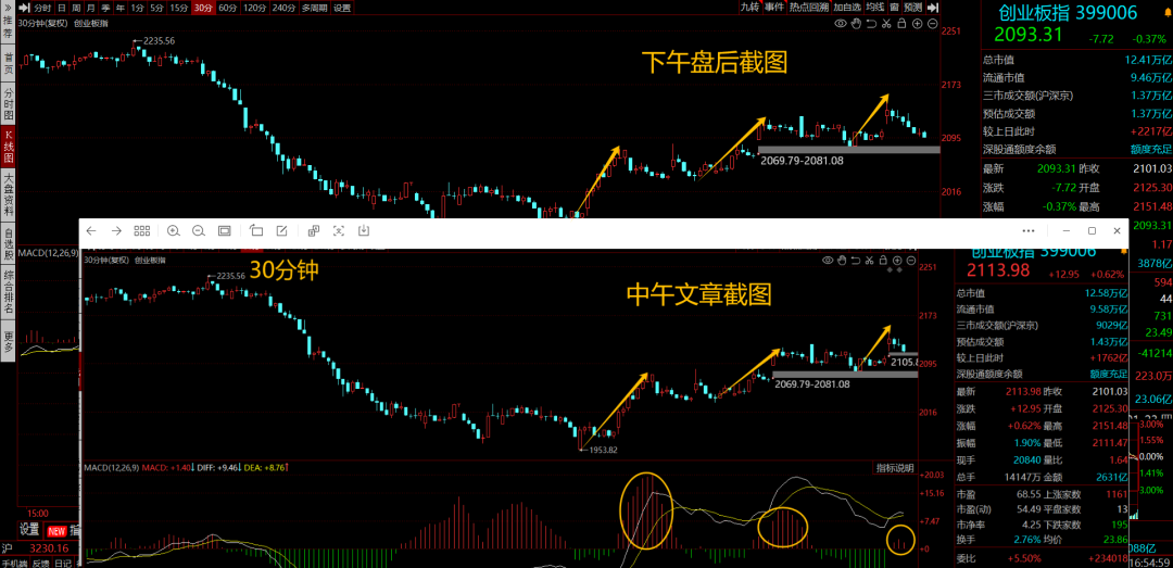 而在中午的文章就明确提示,创业板和深证指数30分钟图走出了类缠论标准走势,要小心进入调整!至少是个60分钟回调,甚至还有扩展成日线回调的可能!