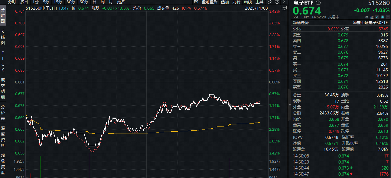 今日(11月3日)一基双拼“半导体+消费电子”的电子ETF(515260)在水面下震荡,午后跌幅缩窄,场内价格现跌1.03%,上交所数据显示,该ETF上周五单日吸金411万元,或有资金看好板块后市,逢跌进场布局!