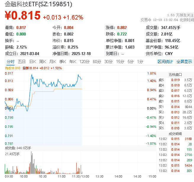 金融科技ETF(159851)上涨1.37%,赢时胜领涨8.2%,AI应用浪潮下金融科技再现机会