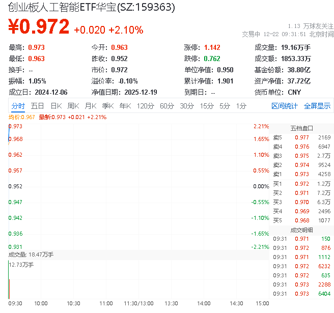 12月22日,截至9时31分,人工智能表现强劲,创业板人工智能指数上涨1.73%,成份股方面,长芯博创领涨5.38%,新易盛上涨4.8%,致尚科技上涨4.41%。热门ETF方面,同标的指数规模最大、流动性突出的创业板人工智能ETF华宝(1