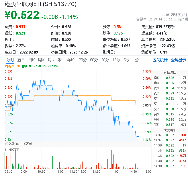 港股互联网ETF(513770)跌1.14%,狮腾控股领涨3.57%,AI产业趋势持续催化互联网龙头表现
