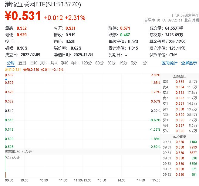 1月5日,截至9时31分,港股科网股表现平淡,中证港股通互联网指数下跌0.3%,成份股方面,快手-W领涨6.26%,大麦娱乐上涨2.25%,平安好医生上涨1.51%。