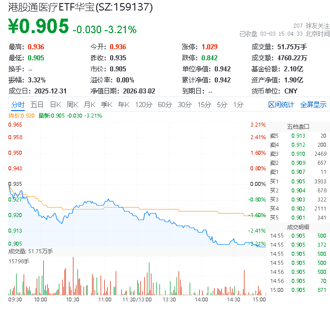 港股通医疗ETF华宝承压回落,晶泰控股逆势拉升3.18%,全球首创糖尿病新药香港获批激活医疗创新赛道
