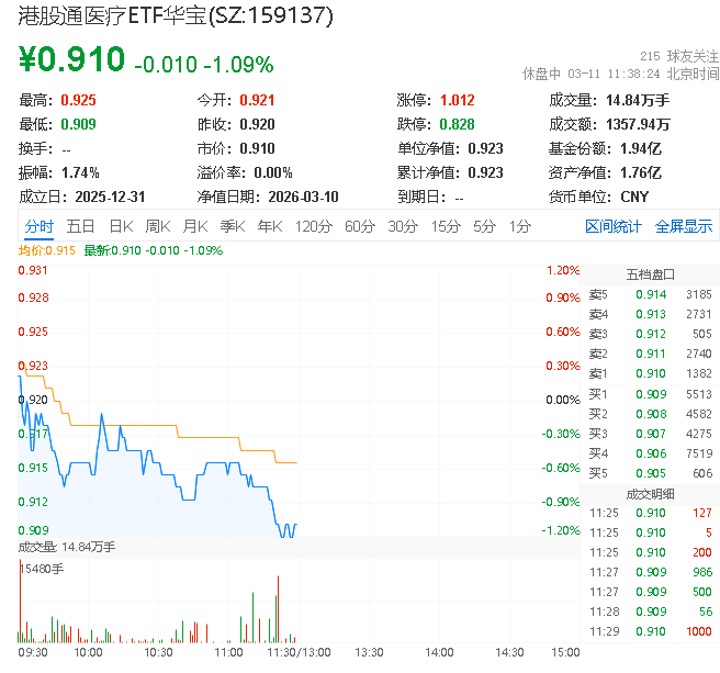 3月11日,截至11时37分,港股通医疗板块表现疲弱,中证港股通医疗主题指数下跌0.58%,成份股方面,复星国际领涨5.99%,药师帮上涨5.9%,微创脑科学上涨4.2%,映恩生物-B下跌7.17%,金斯瑞生物科技下跌2.78%,华润医疗下跌2.65%。