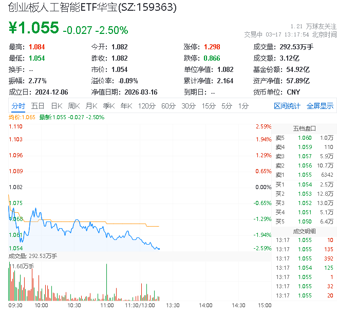 创业板人工智能ETF华宝(159363)下跌2.5%,东方国信领涨8%,电芯片国产替代空间巨大、价值量持续提升。