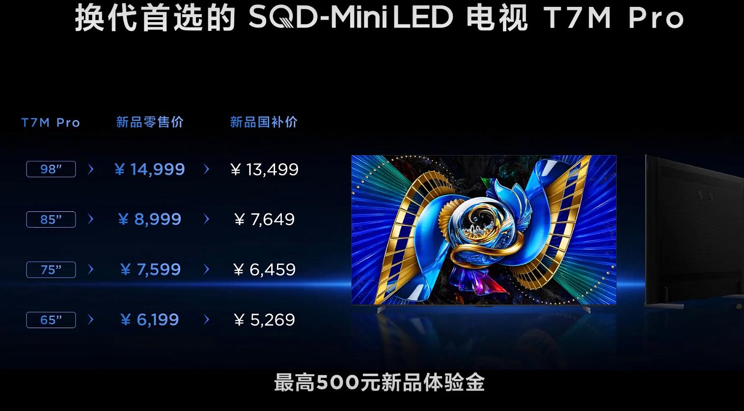 不过,它们的峰值亮度略低一些,提供了四个尺寸,65英寸起,相比Q9M Pro同尺寸价格也更低一些。T7M Ultra起售价6799元,国补价5779元;T7M Pro起售价6199元,国补价5269元。如果你想要一台Mini LED电视,同时对尺寸要求更高,那么T7M Ultra会比较适合你。