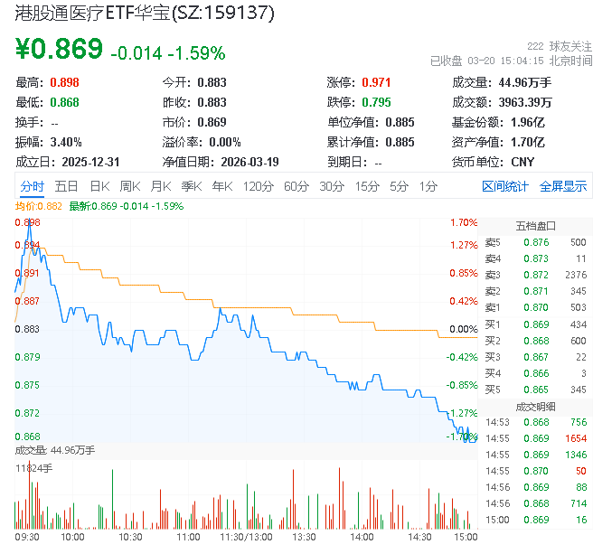 华宝基金港股通医疗ETF(159137)下跌1.59%,药捷安康-B领涨成分出色,脑机接口医疗器械获突破,创新药政策支持稳健发展