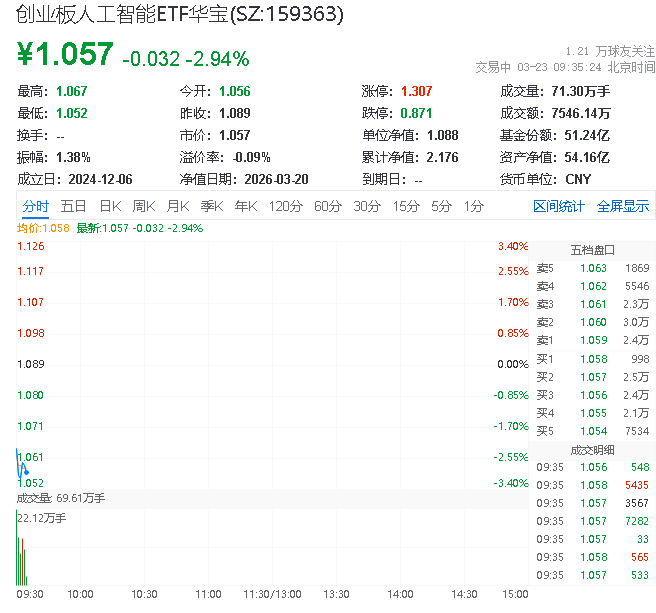 3月23日,截至9时33分,人工智能下挫,创业板人工智能指数下跌2.96%,成份股方面,协创数据领跌6.02%,联特科技下跌5.0%,长芯博创下跌4.67%。热门ETF方面,同标的指数规模最大、流动性突出的创业板人工智能ETF华宝(159