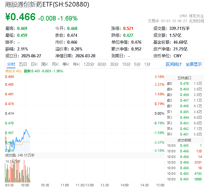 3月23日,截至10时7分, 标的指数无上涨/下跌无,成份股方面,轩竹生物-B领跌10.05%,英矽智能下跌7.65%,银诺医药-B下跌5.37%。热门ETF方面,华宝基金港股通创新药ETF(520880)场内价格下跌1.9%,成交额达