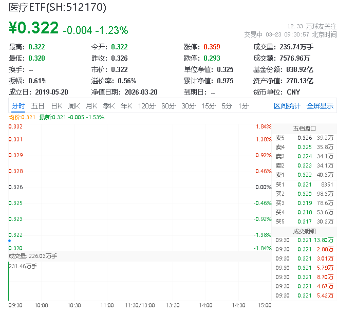 3月23日,截至9时29分,医疗表现疲弱,中证医疗指数下跌1.39%,成份股方面,华大基因领跌2.97%,爱美客下跌2.47%,三博脑科下跌2.38%。