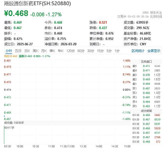 3月23日,截至9时29分, 股票型基金板块 表现平淡 , 无标的指数 下跌 0% ,成份股方面, 派格生物医药-B 领涨 4.2% , 康哲药业 上涨 3.04% , 长风药业 上涨 2.82% 。热门ETF方面, 港股通创新药ETF