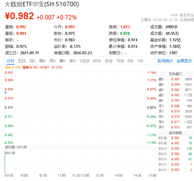 3月24日,截至9时28分, 表现强劲,中证大数据产业指数上涨1.79%,成份股方面,广联达领涨3.64%,易华录上涨3.13%,网宿科技上涨2.88%。热门ETF方面,华宝基金大数据ETF(516700)场内价格上涨1.64%,成交额