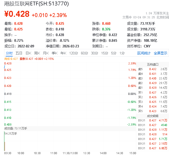 3月24日,截至9时28分,港股科网股表现活跃,中证港股通互联网指数上涨1.4%,成份股方面,迈富时领涨3.92%,大麦娱乐上涨3.17%,狮腾控股上涨3.14%。