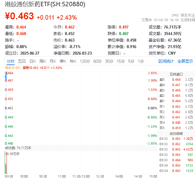 3月24日,截至9时28分,港股通创新药板块表现强劲,标的指数上涨2.21%,成份股方面,康诺亚-B领涨7.63%,长风药业上涨5.89%,MIRXES-B上涨5.38%。热门ETF方面,华宝基金港股通创新药ETF(520880)场内价格