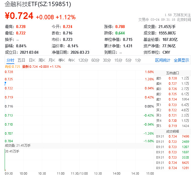 3月24日,截至9时28分,金融科技表现强劲,中证金融科技主题指数上涨1.62%,成份股方面,博睿数据领涨5.31%,普元信息上涨4.06%,古鳌科技上涨4.03%。热门ETF方面,金融科技ETF场内价格上涨1.12%,成交额达161.1