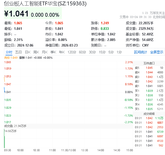 3月24日,截至9时28分,人工智能表现活跃,创业板人工智能指数上涨1.04%,成份股方面,易华录领涨3.13%,太辰光上涨2.95%,网宿科技上涨2.88%。热门ETF方面,同标的指数规模最大、流动性突出的创业板人工智能ETF华宝(15