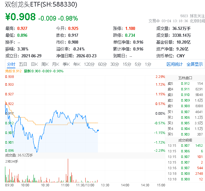 3月24日,截至13时18分,科创、创业表现疲弱,中证科创创业50指数下跌1.01%,成份股方面,芯原股份领涨5.42%,生益电子上涨4.77%,寒武纪上涨4.74%。
