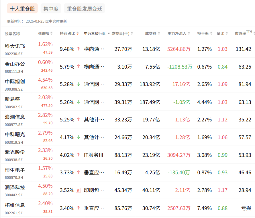 该基金由基金经理张金志管理,自其2025年6月任职以来,取得了超过52%的任职回报,展现了良好的管理能力。其重仓股名单可谓“星光熠熠”,涵盖了从AI算法(科大讯飞、金山办公)、光通信与算力硬件(中际旭创、新易盛)到服务器与数据中心(浪潮信息、中科曙光、紫光股份)等产业链各环节的龙头公司,全面覆盖了云计算与大数据产业的核心资产。