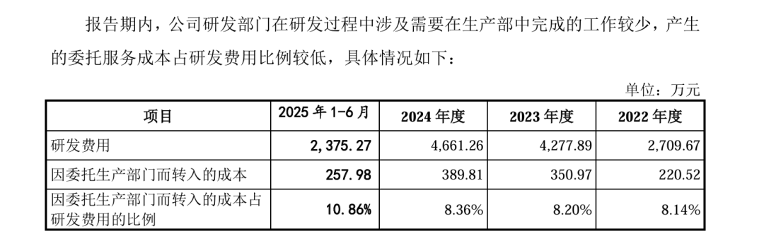 此外,公司历史上还存在生产人员辅助研发的情形,2022年至2025年上半年,因委托生产部门而转入的研发成本占研发费用的比例在10%左右。