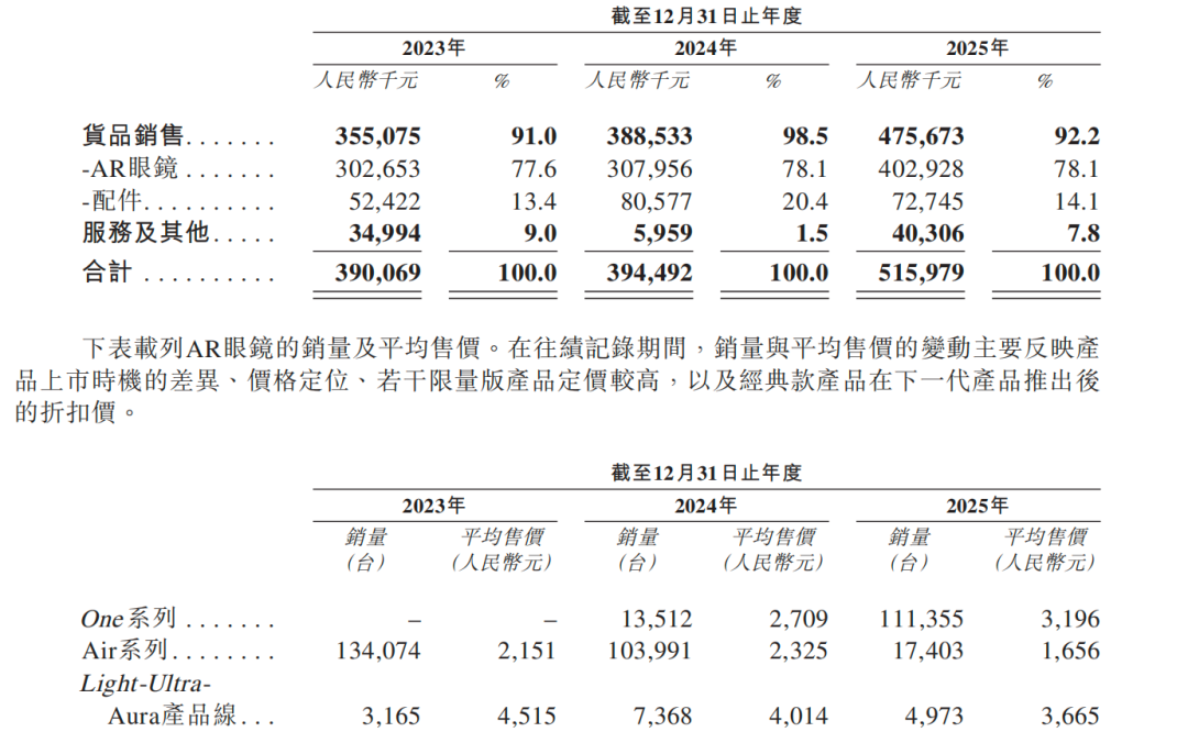 大模型爆发后,Rokid迅速转向全功能 AI 眼镜路线;XREAL则坚持空间显示核心,聚焦影音与便携大屏。招股书显示,XREAL2023年-2025年的主要收入都来自AR眼镜及相关配件的销售;按销售收入计,XREAL从2022年至2025年间每年在全球AR眼镜市场中位居第一。