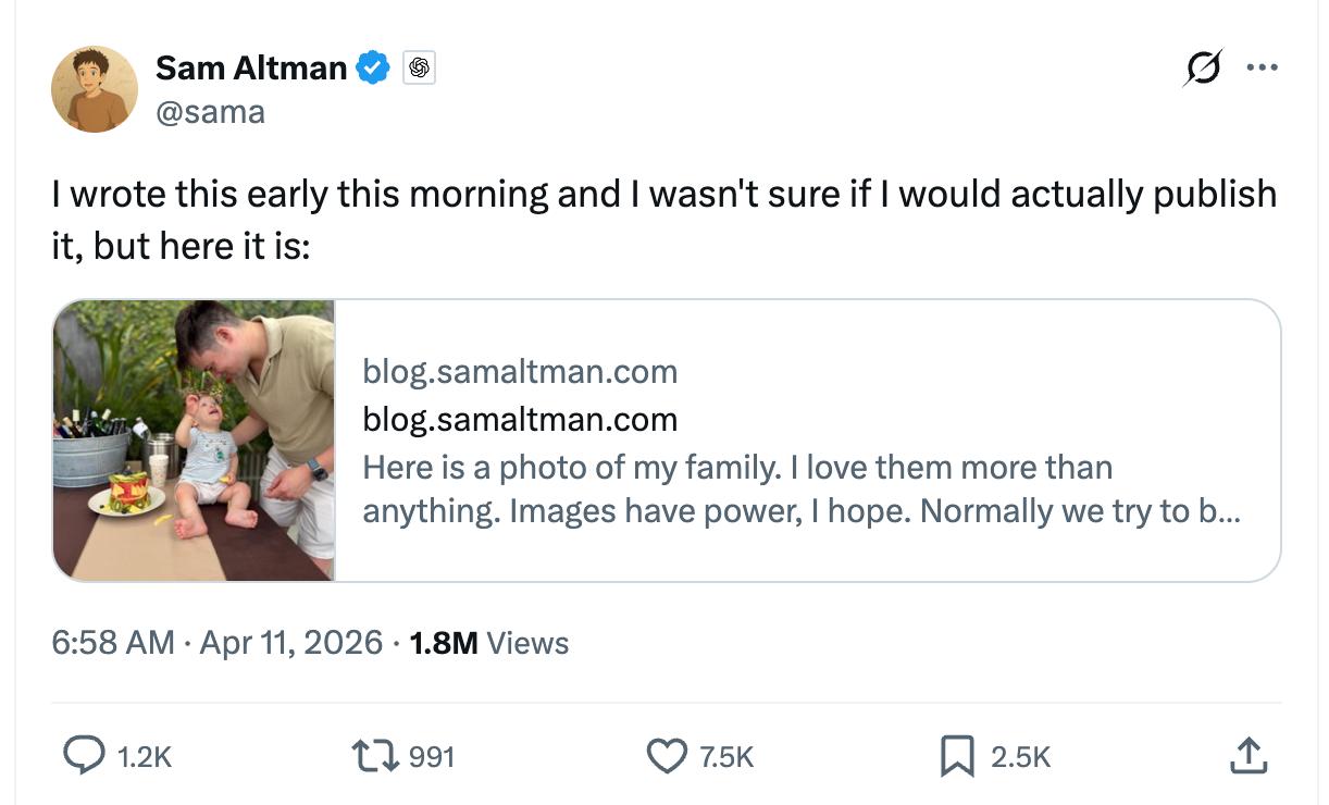 凌晨写完这篇文章后,奥特曼纠结了一阵子才发出来。在这篇文章中,他还晒出了伴侣与儿子的合照,并表示希望“以此劝阻下一个人——无论他们对我有什么看法——都不要再往我家扔莫洛托夫鸡尾酒(汽油弹)了”。