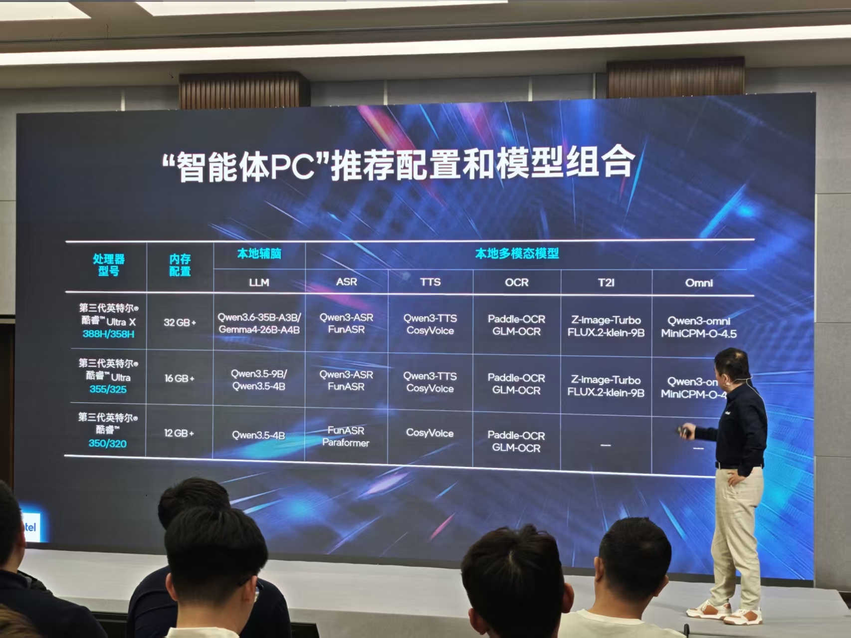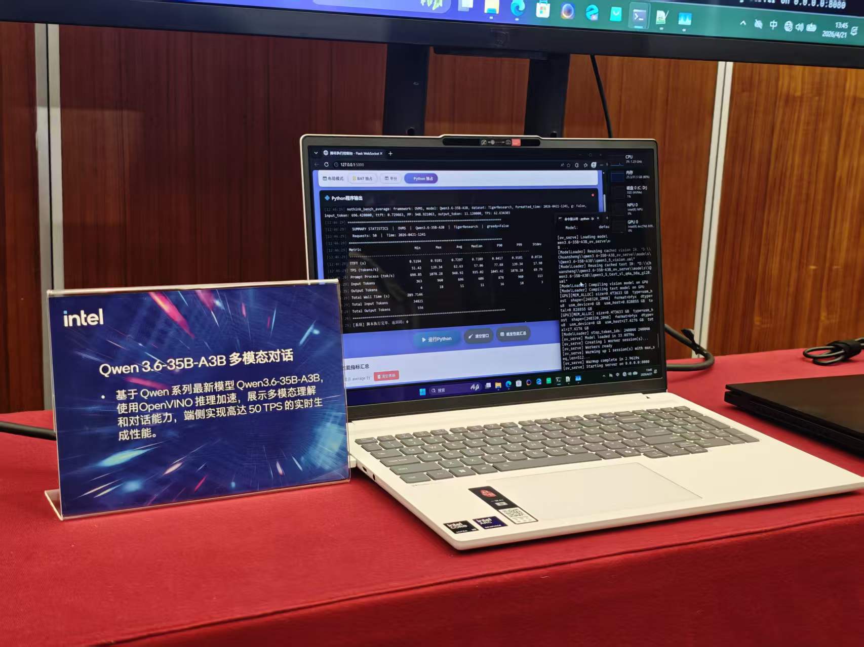 从现场运行的Demo来看,英特尔在本地部署的是Qwen3.6-35B模型,这个参数量自然是经过控制的,但也恰好符合现场布置的这些电脑的硬件需求,用Arc B390核显搭配上32GB显存,刚好能达到60tokens/s的生成速度。