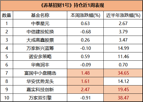 《养基招财1号》上周赚1500元;《养基招财2号》上周亏585元,两个组合合计赚900多元,来了个不赚不亏。