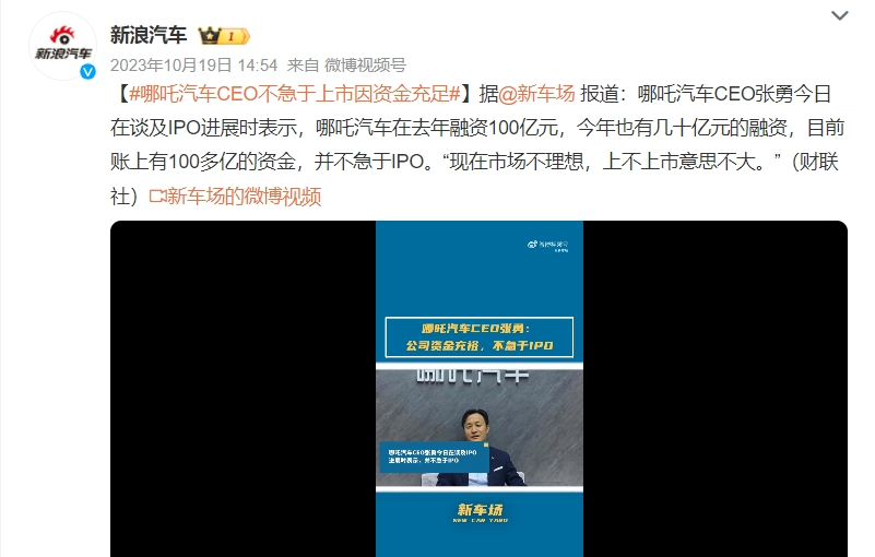不过哪吒汽车账上还有钱。2023年10月18日,张勇在谈及IPO进展时表示,哪吒汽车在2022年融资100亿元,2023年也有几十亿元的融资,目前账上有100多亿的资金,并不急于IPO;他还进一步表示,现在市场不理想,上不上市意义不大。