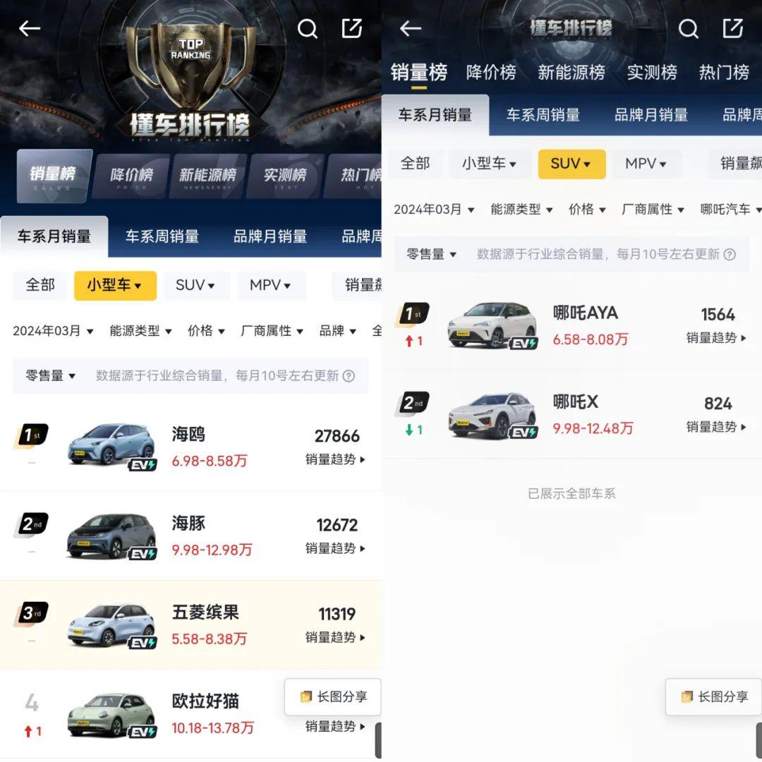 在售价10万元-20万元的中低端汽车市场上,哪吒汽车的销量与比亚迪海鸥(6.98-8.58万元)和五菱缤果(5.58-8.38万)两款车型的销量还有一定的差距。仅2024年3月,比亚迪海鸥售出3.48万辆;五菱缤果销量近1.3万辆,而同期,哪吒AYA、哪吒X仅售出1564辆、824辆。