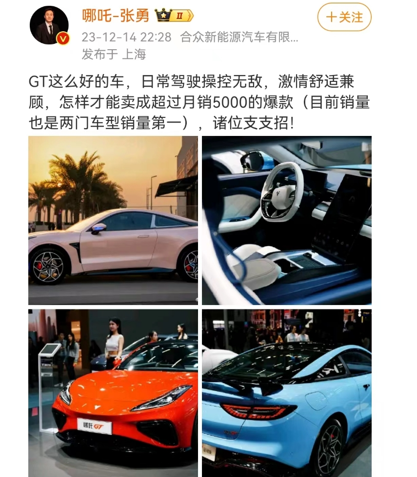 也就是说哪吒汽车的“主战场”还是在低端市场,在中高端市场上,被哪吒寄予厚望的哪吒S和哪吒GT反响平平。2023 年 12 月,张勇甚至在微博发文“求助”网友,该如何让哪吒 GT 卖成超过月销 5000 的爆款。
