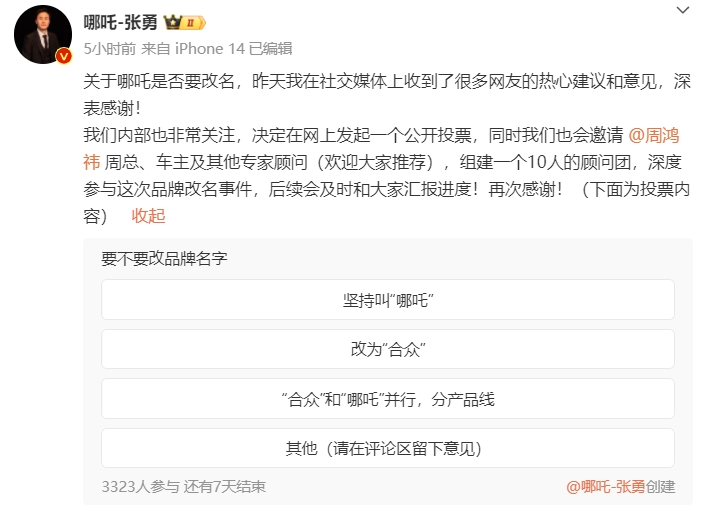 但好在,哪吒汽车十分“听劝”。在一个月之前,周鸿祎曾在直播中直言不讳表示,哪吒汽车命名怪异;在北京车展上,周鸿祎再次提及希望哪吒汽车改名。4月28日,张勇便在抖音发布名为“全网征集哪吒改名建议”的视频,邀请网友们在评论区留言;同时,张勇还在微博上发起了投票活动,并称会邀请周鸿祎、车主和专家顾问组建10人的顾问团,深度参与品牌改名事件。
