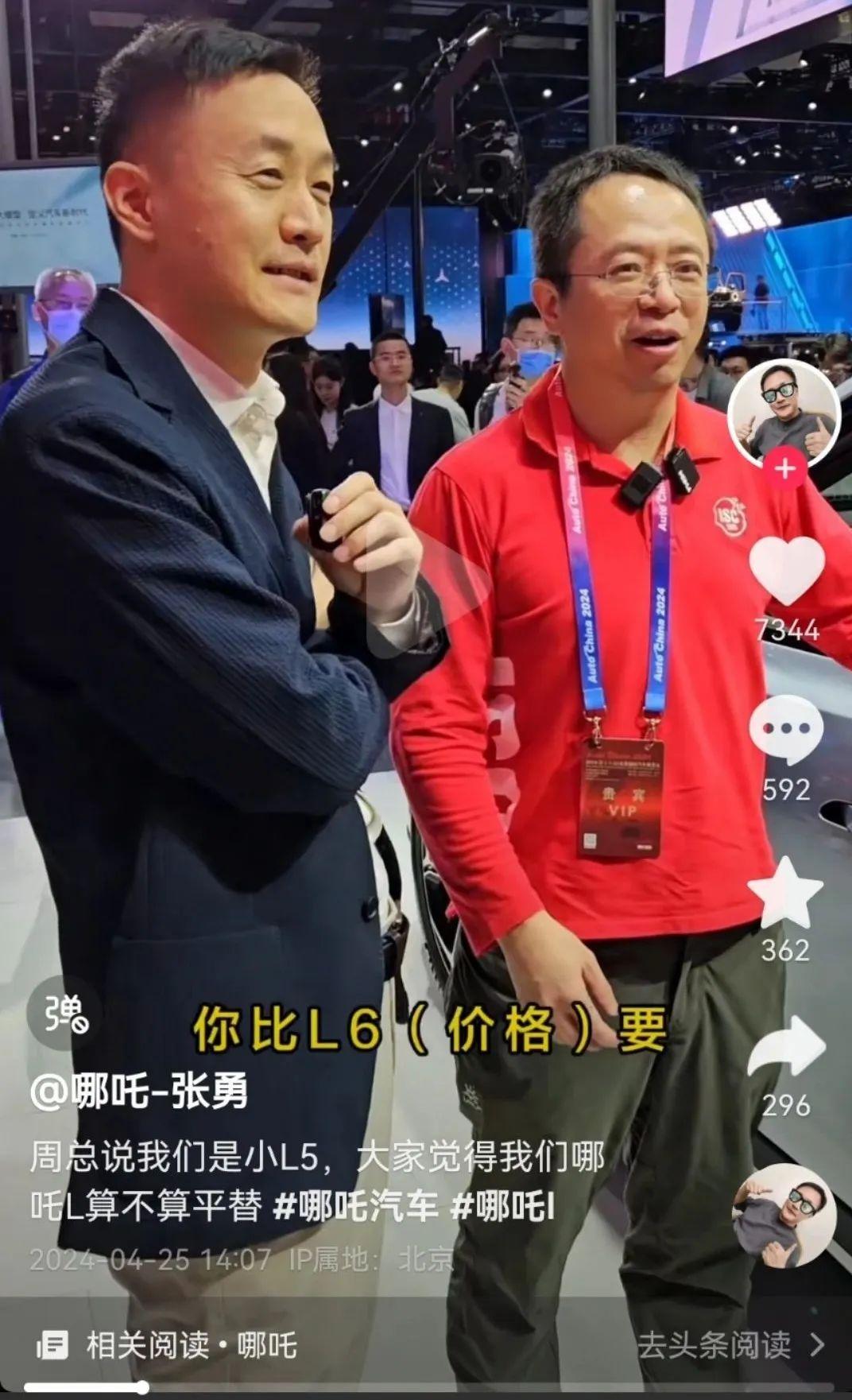 随后,哪吒汽车联合创始人、CEO张勇还带着周鸿祎在车内体验了一把。“空间比理想L6小一点,但是价格可少了10万。”周鸿祎夸奖道。张勇连忙纠正道:“少一半呢,理想L6是24万元,哪吒L最低是12.99万元。”两人一唱一和,属实给哪吒L打了一波广告。