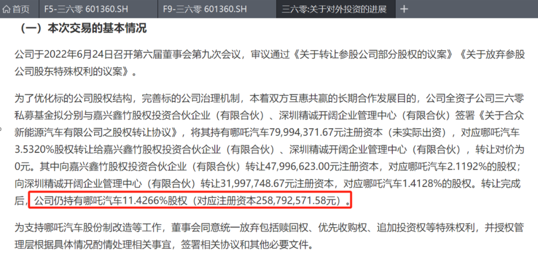 持续亏损的业绩让三六零对哪吒汽车的态度,有了微妙的转变。早在2022年6月26日,三六零旗下全资子公司三六零私募基金将其持有的对应哪吒汽车3.53%股权的出资权,转让给了两家有限合伙企业。转让完成后,三六零仍持有哪吒汽车约11.43%股权。