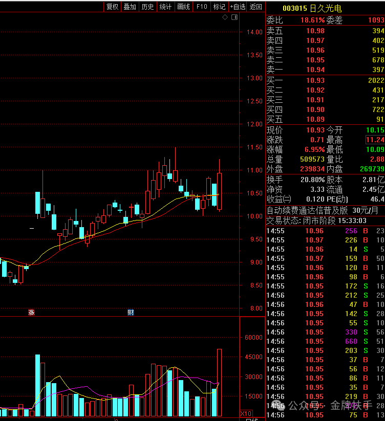 买入前5的营业部买入额(万)卖出额(万)净额(万)东方证券上海静安区延平路2261.2186.382174.83机构专用1870.141808.5861.56机构专用947.11285.72661.38华鑫证券深圳益田路787.130.00787.13方正证券杭州白石巷747.0512.86734.18卖出前5的营业部买入额(万)卖出额(万)净额(万)机构专用1870.141808.5861.56东方证券上海杨浦区控江路113.561279.31-1165.75东方财富证券拉萨团结路第一516.61492.9623.65东方财富证券拉萨金融城南环路396.55484.06-87.51平安证券杭州杭大路78.70384.87-306.17技术面上,日久光电今日早盘在60日线上方放量拉升一度触及涨停板,后市还是有一定持续上涨预期的,操作上可以考虑在60日线上方继续看反弹,注意后市股价一旦出现急拉不涨停收长上影线或者大幅高开低走收阴等滞涨现象则需要考虑逢高减仓或者出局。